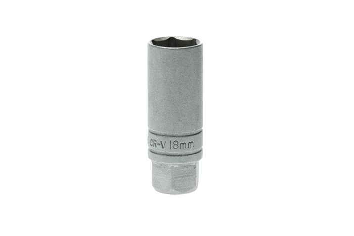 3/8" drive 6 point 18mm spark plug socket made from chrome vanadium with a satin finish and rubber insert.