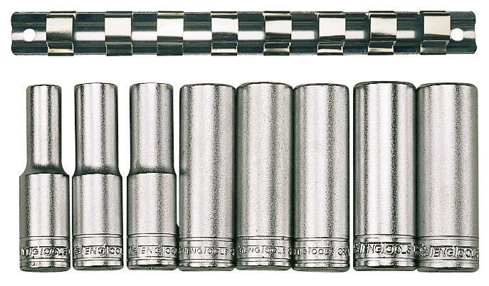 Set of 8 deep 1/2" drive 12 point metric sockets supplied on a clip rail. Made from chrome vanadium steel with a satin finish.