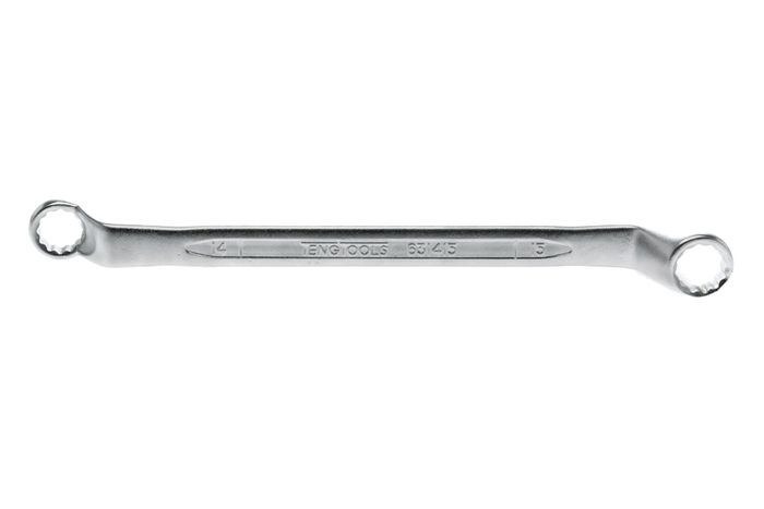 Double ring metric spanner with different bi-hexagonal openings at each end. Double curved 75° - high angle. Made from chrome vanadium with a satin finish. DIN 838.
