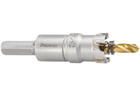 Tungsten carbide tipped with positive rake teeth for high alloy and stainless steels, nonferrous metals and reinforced fabrics. Complete assembly with arbor and pilot drills. Recommended for use on sheet metal up to 1/8" (3mm) thick.