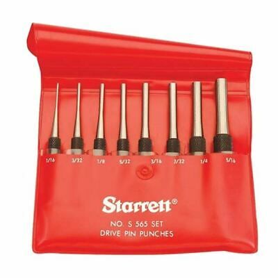 The Starrett 565 Drive Pin Punch is well proportioned, hardened, properly tempered, nicely finished, and have a knurled finger grip. Each punch has the size stamped on the head. SET of 8: 565A/B/C/D/E/F/G/H in Protective Vinyl Case.
