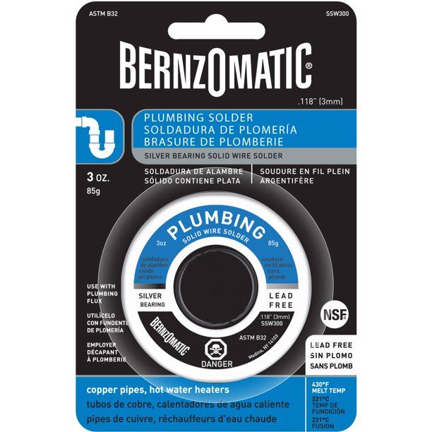 designed for general plumbing applications and repairs. Use it for soldering water-tight seals on copper pipes, hot water heaters and plumbing fixtures. Combine with plumbing flux (sold separately) for excellent performance. Featuring a silver bearing, this 3 oz lead-free plumbing solder meets ASTM B32 specifications and is NSF certified, so it's safe for potable water systems. Its melting temperature is 430 degrees Fahrenheit/221 degrees Celsius.Premium silver bearing solder wire