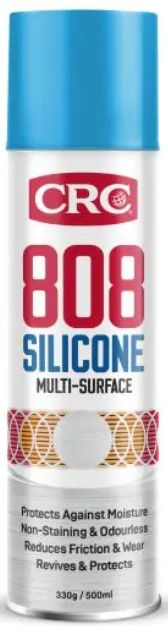 CRC 808 Silicone is a multi-purpose silicone spray for general lubrication. It leaves a thin, clear, odourless film that lubricates, waterproofs and revives without damaging treated surfaces or leaving marks or stains. It provides ongoing protection over a wide range of temperatures and pressures.