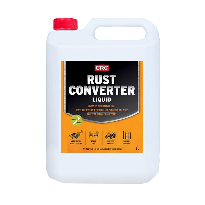 CRC Rust Converter is a unique fast drying coating formulated for treatment of lightly rusted or correctly prepared metal surfaces. CRC Rust Converter neutralises rust and converts it to a tough black primer in one easy step. It binds to the surface and provides a waterproof barrier by sealing out moisture and other outside elements for effective long-lasting rust protection. No more sandblasting, heavy scraping, or grinding.