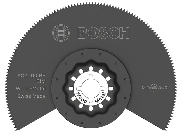 The Starlock ACZ 100 BB blade delivers wide and deep flush cuts in wood, metal and plastic. Broad cuts in door frames and smaller mouldings as well as long cuts on the floor are made possible by the blade's extra-wide 100 mm diameter. These broad cuts are reinforced by Bosch's patented circular welding technology that prevents jamming and reduces burn marks. This exclusive technology welds a wider HSS (high-speed steel) strip onto a thinner HCS (high carbon steel) base body, resulting in teeth that are freestanding and tough. The blade is suitable for use with all Starlock, Starlock Plus and Starlock Max power tools as well as common multi-tools.