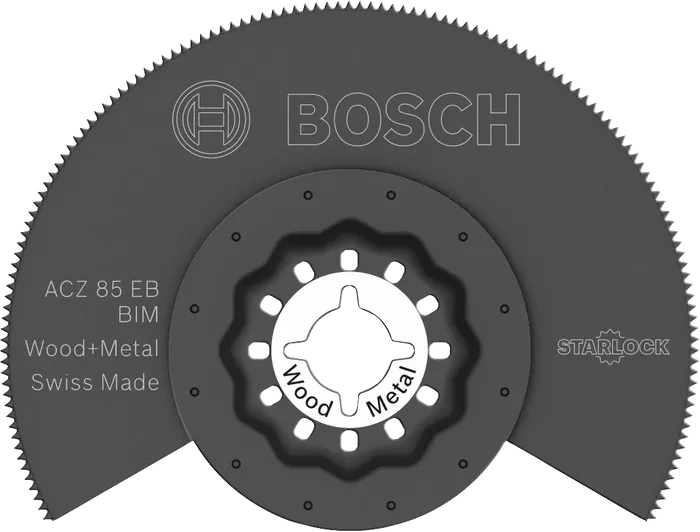 The Starlock ACZ 85 EB blade ensures long life when cutting wood or non-hardened metal. Its BIM (bi-metal) base combines an HCS (high carbon steel) blade and HSS (high-speed steel) teeth to resist wear and heat when cutting non-hardened metals and abrasive materials. Bosch’s patented circular welding technology fuses HSS strips to an HCS blade base for tough freestanding teeth, preventing jams and burn marks and providing dependable results with repeated use. This blade is designed for cutting door frames and smaller mouldings to length, cutting out laminate and parquet, flush cutting wood and cutting non-hardened metal, plastics and sandwich metals. It is compatible with all Starlock, Starlock Plus, Starlock Max power tools and common multi-tools.