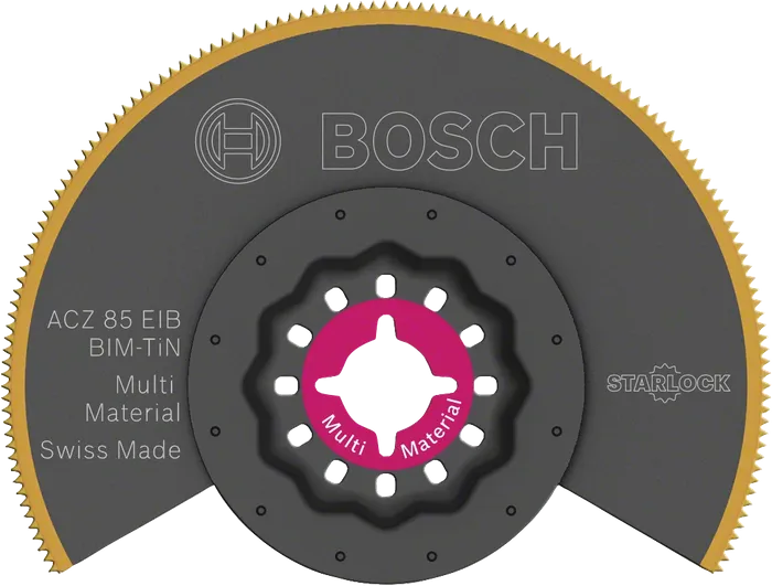 The titanium-coated Starlock ACZ 85 EIB blade has an extra 30% longer lifetime than uncoated BIM (bi-metal) blades. Its TiN (titanium-nitride) coated tooth strip is very heat- and wear-resistant, ensuring extra-long performance. Bosch's patented circular welding technology creates tough freestanding teeth, preventing jams and burn marks and allowing for extended usage. Use for plunge cutting in plasterboard, cement-bonded fibre boards, wood, non-hardened metal, small mouldings, fibreglass and epoxy-reinforced plastic. All Starlock, Starlock Plus and Starlock Max power tools as well as common multi-tools are compatible with the blade.