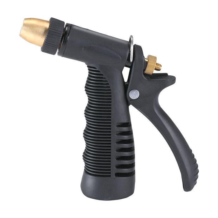 This ergonomically-shaped, die-cast zinc hose nozzle has a soft, black, vinyl grip for a comfortable hold. It includes a hold-open clip for constant water flow and has a stainless steel spring. Also included is a standard screw-in house quick connect end that works with most quick connect systems.