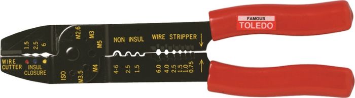 - Handy multi-application tool for wire cutting, crimping insulated and non insulated terminals, screw cutting and wire stripping.