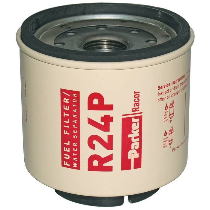 - The filter body is protected with a durable electrostatically-applied powder coating for superior corrosion resistance. The spin-on filter design is simple to service and features a reusable clear engineering plastic or metal contaminant collection bowl with a self-venting drain for draining out collected contaminants and water. All Spin-on Series replacement cartridge filter elements utilize Racor’s high-efficiency Aquabloc engineered media. Aquabloc® is a blend of high-grade cellulose compounded with resins and a special chemical treatment. It incorporates pleat-spacing corrugations and a graduated pore structure to increase dirt-holding capacity and extend filter life. The media is waterproof and rustproof, capturing contaminants while the specially treated surface separates and coalesces water from the fuel, which causes the water to gather into large droplets that then fall into the fuel filter’s collection bowl.