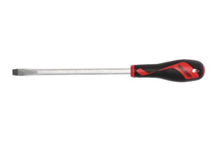 Flat screwdriver with an ergonomically designed two component handle with hanging hole. Made from chrome vanadium with a black tip