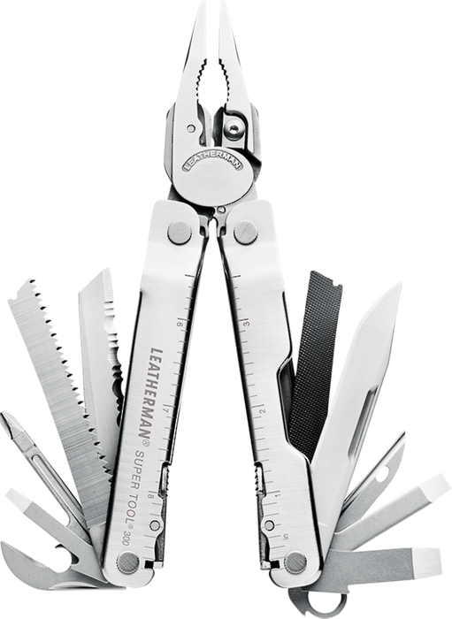 The award-winning, Leatherman Super Tool 300 is the multi-tool for the working man. Larger pliers are the strongest we've ever produced and the sloped-top handle design means you can maneuver them further into tight spaces. When you're working with gloves on, the large side cutouts make it easy to still grab components and rolled handles make for a comfortable grip. Stranded, hard and regular wire cutters all come standard on Super Tool 300, and because they're removable you can repair or re-sharpen on the spot. 19 tools all ready for your toughest jobs. Super Tool 300 is back from vacation and ready to get to work.