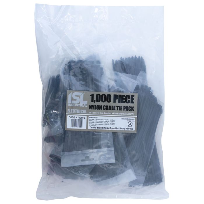 ISL Nylon Cable Ties use UL approved nylon 6/6 with flammability rating of UL94 V2. Pack Contents: 100mm x 2.5mm 200 150mm x 3.6mm 200 200mm x 4.8mm 400 300mm x 4.8mm 200