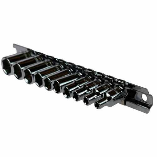 A professional grade 10 piece 1/4 inch drive clip rail socket set. Set includes 4mm, 5mm, 6mm, 7mm, 8mm, 9mm, 10mm, 11mm, 12mm, 13mm.