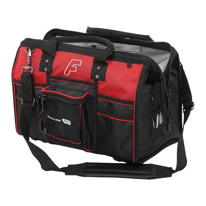A professional grade tool bag that is water resistant and has a variety of different sized storage compartments.