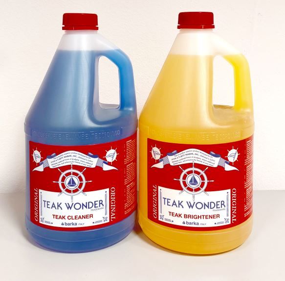 Teak Wonder leaves the deck looking like ‘new’. Applying the two products contained in each bottle one after the other washes away the grey colour that has accumulated in the wood only to rediscover the splendid golden colour that new or just sanded teak possesses. All in a few minutes and without removing millimetres of precious wood from the deck, as occurs during sanding. Neither of these two liquids is aggressive or caustic and therefore does not damage rubber, paint or stainless steel fittings. An incredible way of saving time and effort. Teak Wonder Brightener does not always have to be applied, however, using it on teak just washed with Teak Wonder Cleaner when it is rather dark, is a miraculous sight: it immediately acquires that just sanded colour.