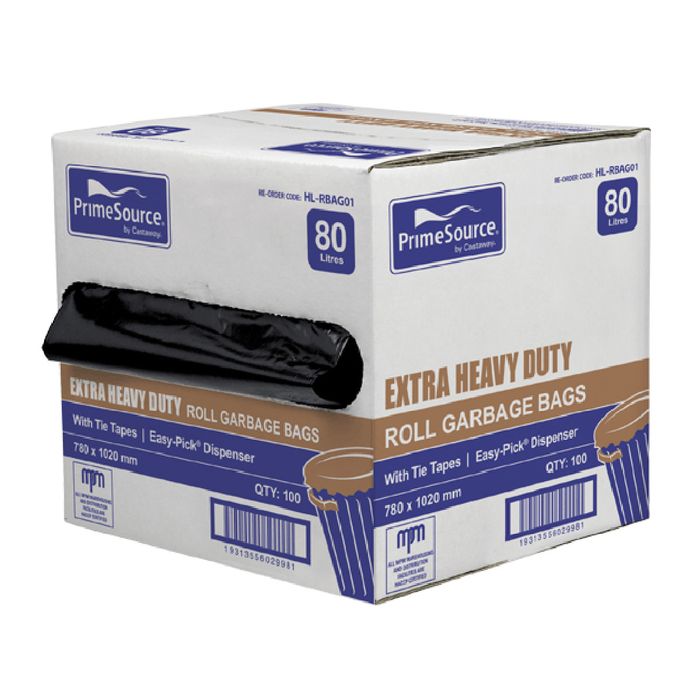 PrimeSource' Extra Heavy Duty 80L Roll Garbage Bags Star Seal, Low Density, Black With Tie Tapes & Easy-Pick' Dispenser Size: 80 Litres / 780 x 1020 mm. 22.5mu Qty: 100 per carton *Easy-Pick' roll dispenser *Low Density for Extra Strength *Star seal base helps to prevent leaks *Suitable for medium size garbage bins